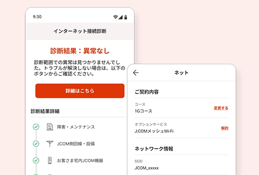 - 診断はJ:COMサービスに限る。「J:COM NET 光 on auひかり」/「J:COM NET 光(N)」では利用不可。詳しくはJ:COMまで。