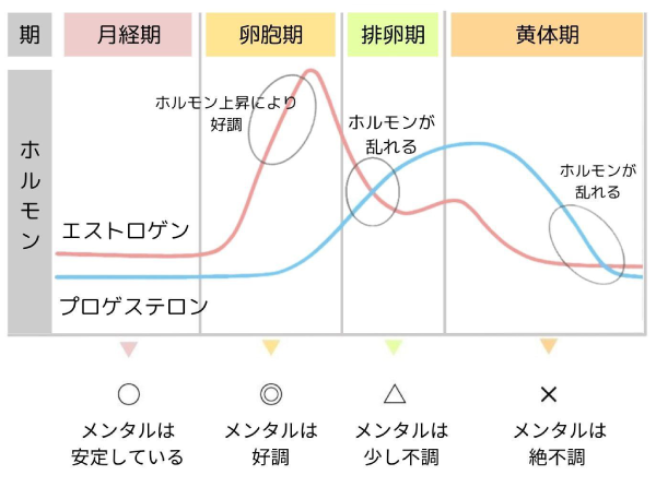 女性の体には、エストロゲン(卵胞ホルモン)とプロゲステロン(黄体ホルモン)という2種類のホルモンがあり、生理周期に合わせてその分泌量が変化します。