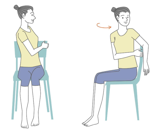 椅子に座った状態で足を地面につけ、後ろを向いて椅子の背を持てるくらいまで上半身をひねります。これを左右5回ずつ行います。仕事の合間などにぜひやってみてくださいね。